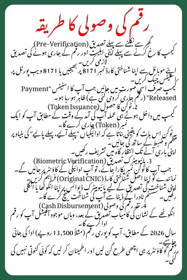 - Check Status First: Before leaving home, send your CNIC to 8171 or check the 8171 Web Portal. Only visit the camp if your status shows “Payment Released.”