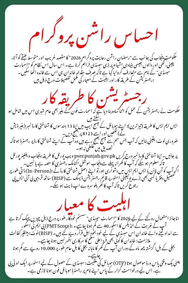 The Ehsaas Rashan Program (often referred to as the Rashan Riayat Program) has been revitalized for 2026 to provide significant subsidies on essential food items like flour, ghee, pulses, and sugar. In Punjab, this program is closely integrated with the Ramzan Nigehban Package and the 8123 registration portal.