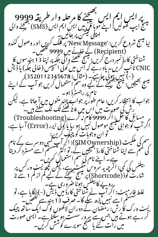 - SIM Ownership: The system often rejects messages sent from a SIM not registered to the CNIC provided.